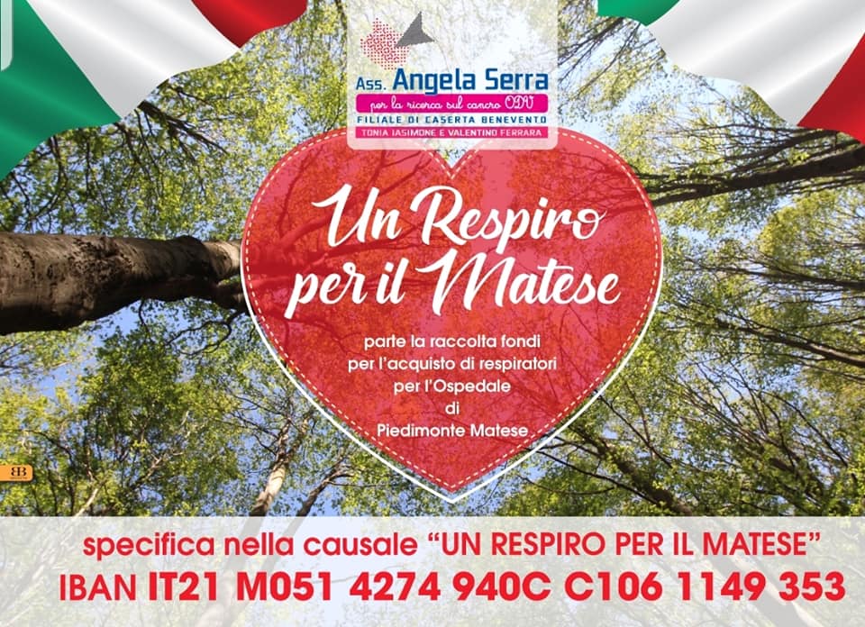 L’Associazione “Angela Serra” di Caserta e Benevento, con altre associazioni del territorio, enti, aziende e liberi cittadini, lancia l’iniziativa “UN RESPIRO PER IL MATESE”.L’intento è quello di avviare una raccolta fondi finalizzata all’acquisto di uno o più ventilatori polmonari da mettere a disposizione dei pazienti afferenti all’Ospedale Civile A.G.P. di Piedimonte Matese, in particolare di quelli affetti da malattie oncologiche, al fine di supportare i pazienti e la struttura sanitaria nell’attuale emergenza legata al COVID-19.Per partecipare all’iniziativa basterà fare un bonifico sul conto corrente dell’Associazione, specificando nella causale: “PROGETTO UN RESPIRO PER IL MATESE”. Il conto corrente si trova presso la Banca di Credito Popolare di Piedimonte Matese – IBAN IT21 M051 4274 940C C106 1149 353. Con questa iniziativa, in linea con le attività che normalmente svolge l’Associazione Angela Serra sia a livello della sede centrale di Modena che delle varie filiali italiane, intendiamo unire le forze di un intero territorio per donare, al nosocomio matesino, delle attrezzature mediche di fondamentale importanza in questo momento. Per garantire a tutti la trasparenza, a donazioni ultimate, saranno ringraziati come di dovere tutti i benefattori, e a chi lo chiederà verrà inoltre rilasciata regolare ricevuta.Il Consiglio Direttivo Dott. ssa M.D. Fidanza, Dott. A. Orsi, Dott. B. Di Matteo