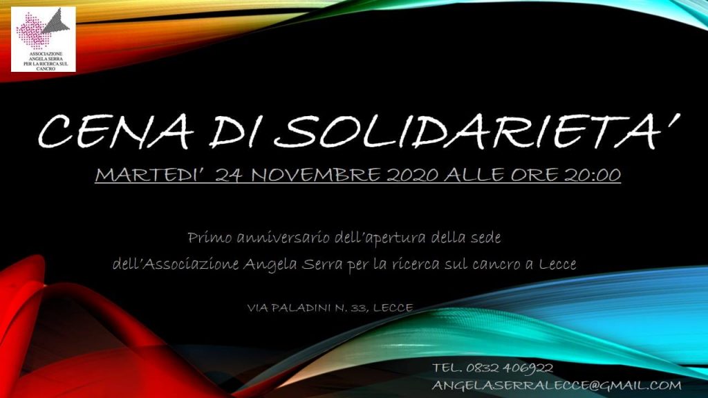In occasione del primo anniversario della sede di Lecce, l'Associazione Angela Serra per la ricerca sul cancro O.D.V. organizza una cena di solidarietà.
