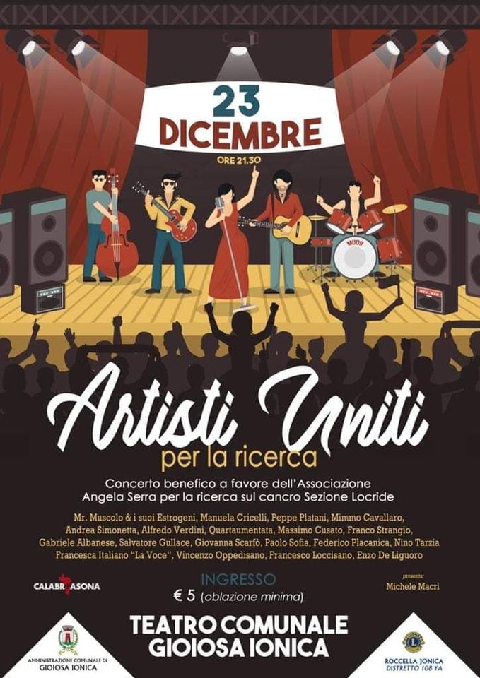 23Dic2019 Da 21.30A Teatro Comunale – Gioiosa Jonica (RC)Artisti uniti nella lotta contro i tumori. Concerto di beneficenza in favore della nostra Associazione.