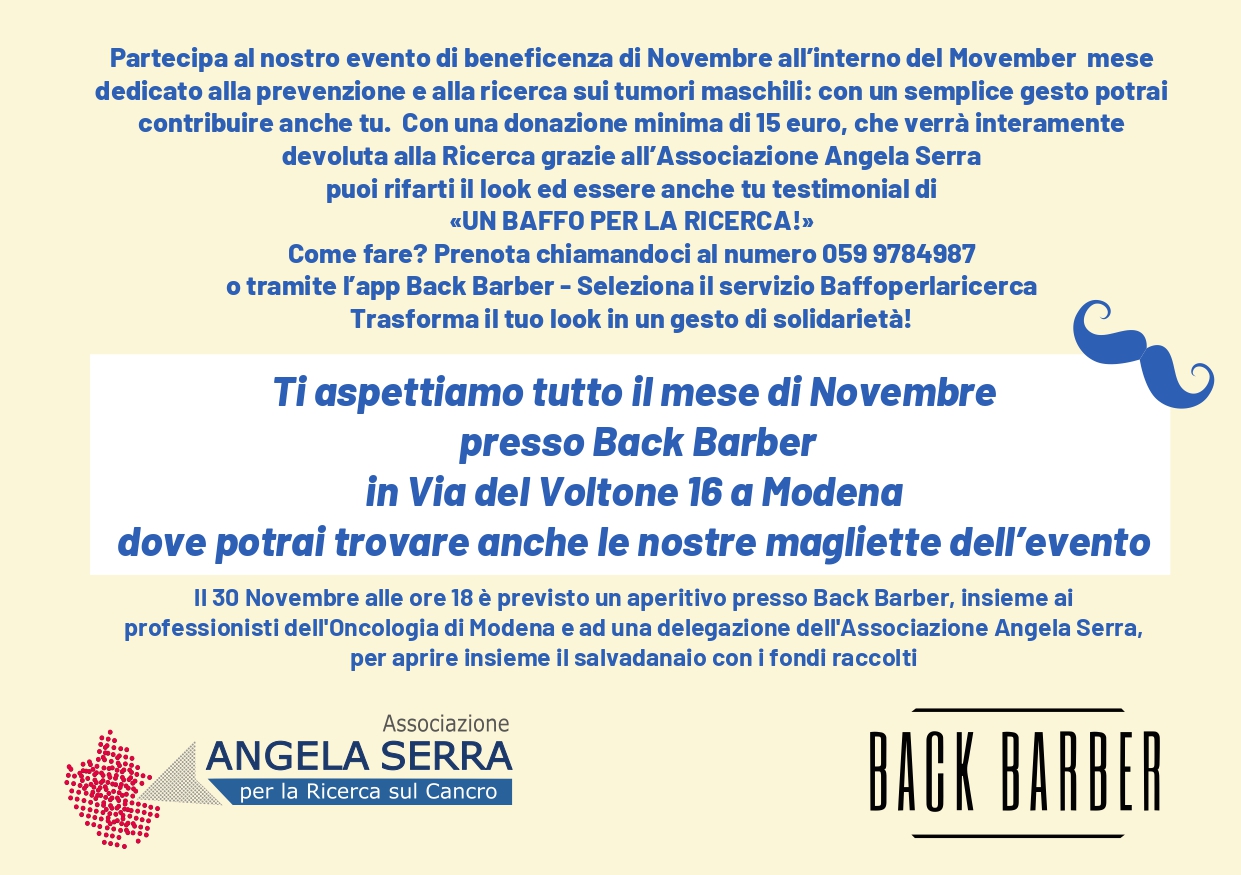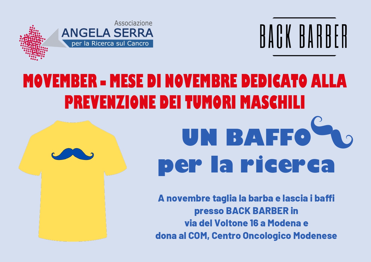 Taglia la barba e lascia i baffi! Per tutto il mese di novembre potrai contribuire alla prevenzione e alla ricerca sui tumori maschili prenotando presso il Back Barber il taglio della barba lasciando i baffi. Tutte le indicazioni sono nel volantino