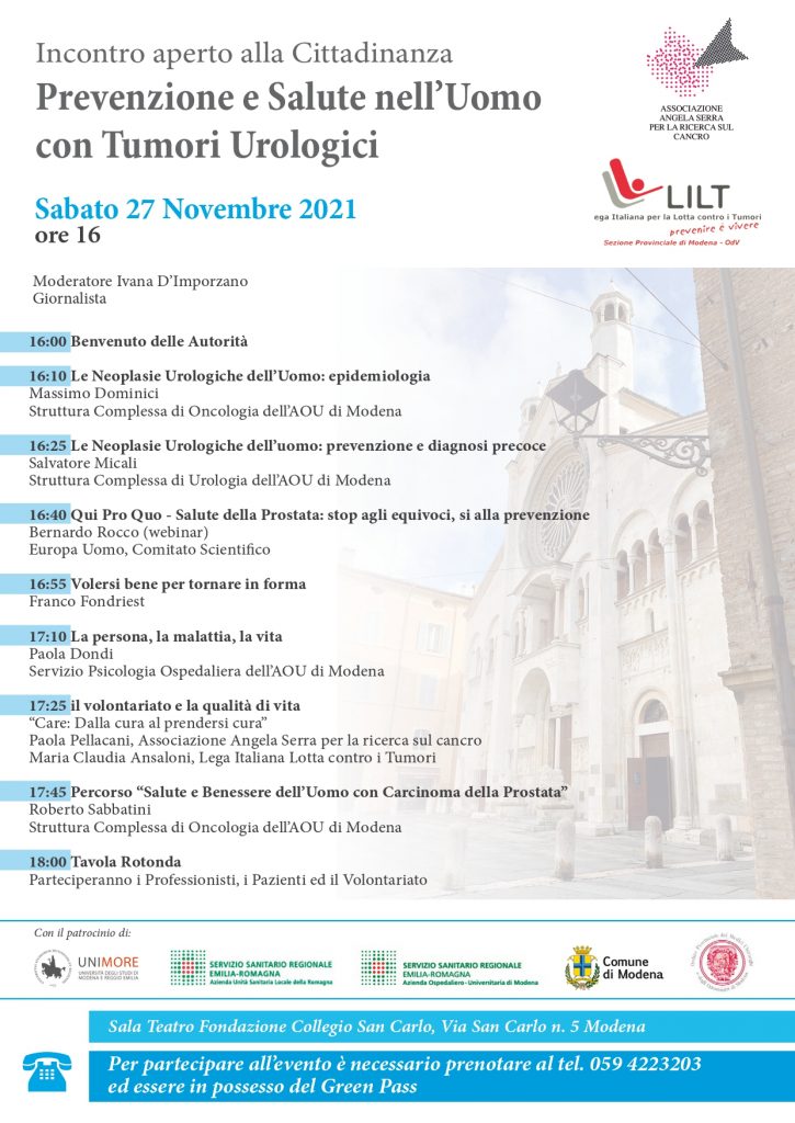 Da Incontro aperto alla cittadinanza sui tumori maschili. E' prevista la partecipazione di pazienti, associazioni di volontariato e professionisti. Per info e prenotazioni 059 4223203 e serra@unimore.it