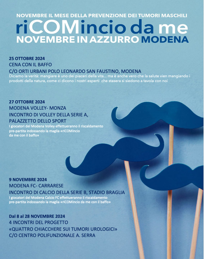 Novembre è il mese dedicato alla prevenzione dei tumori maschili: abbiamo organizzato una serie di eventi per sensibilizzare le persone su questo tema che non è da sottovalutare p.s. il 27 ottobre e il 9 novembre, facendo una donazione si può ricevere la maglia dedicata al Movember firmata dai giocatori del Modena Volley e del Modena Calcio