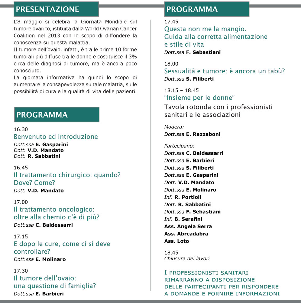 Una giornata informativa con lo scopo di incrementare la conoscenza sul tumore ovarico, sulle possibili cure e sulla qualità di vita.