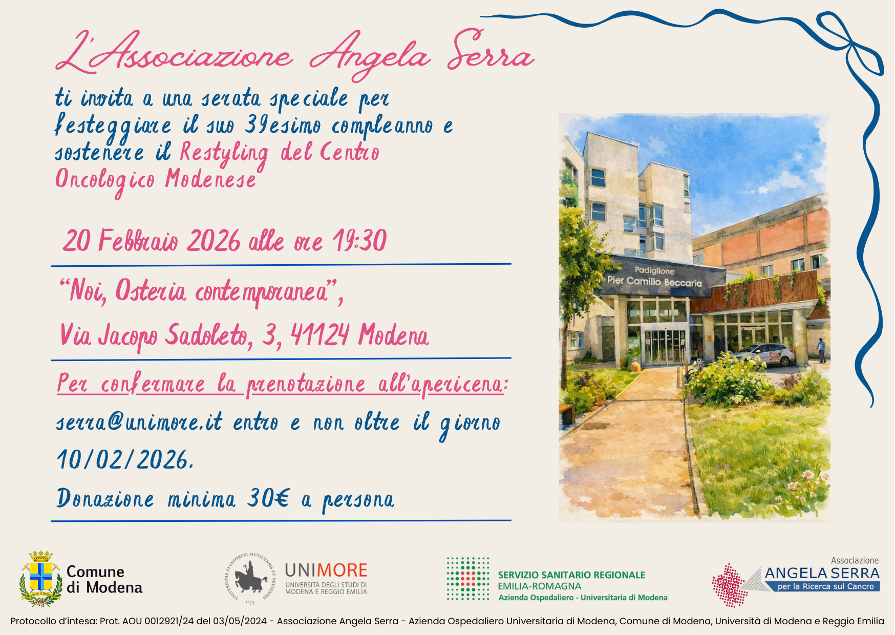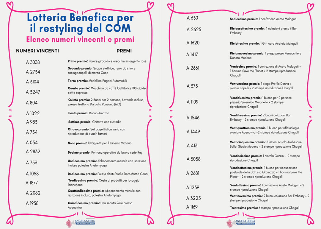 Si ringraziano i tantissimi cittadini che ci hanno supportato con la loro generosità e insieme a loro, tutte le associazioni, enti privati e imprese del territorio che ci hanno sostenuto con contributi tangibili. Un grazie dal cuore a Fondazione di Modena – CNA – Confcommercio – Lapam – Olitalia srl – Italpizza – Usco spa -Conad – Lega Coop Estense – International Police Association – Modena Calcio – Cotamo Taxi – LAR SPA – Gruppo di Solidarietà Tetra Pak – Comitato degli Amici di Simone Girotti Tecnodiamant – P.B.E Commerciale – Acetaia Leonardi – La Sfoglia – Dìstìlla – Italpizza – Ristorante Bondi – Hera S.p.a